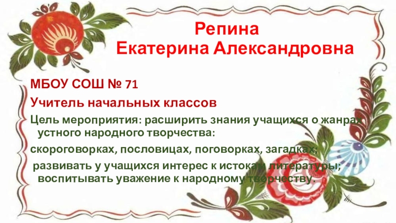 развивать у учащихся интерес к истокам литературы; воспитывать уважение к народному творчеству.
