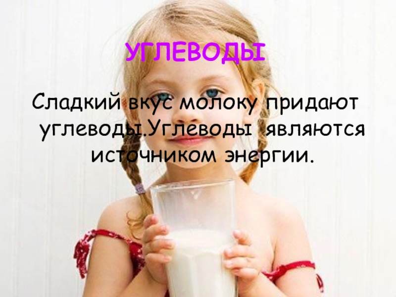 УГЛЕВОДЫСладкий вкус молоку придают углеводы.Углеводы являются источником энергии.