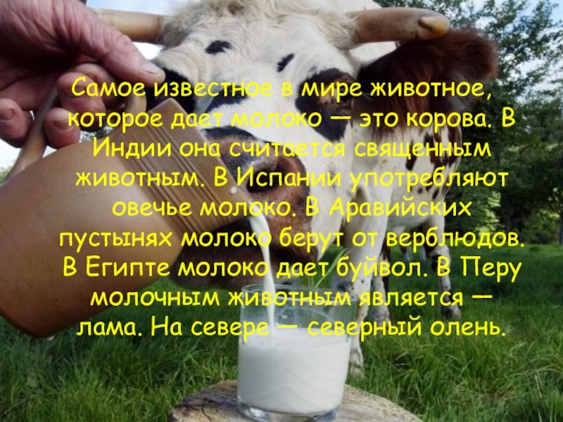 Слайд 10Самое известное в мире животное, которое дает молоко — это корова.