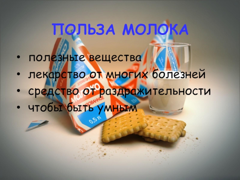 ПОЛЬЗА МОЛОКАполезные веществалекарство от многих болезнейсредство от раздражительностичтобы быть умным