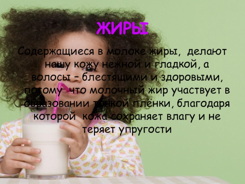 ЖИРЫСодержащиеся в молоке жиры, делают нашу кожу нежной и гладкой, а волосы – блестящими и здоровыми,
