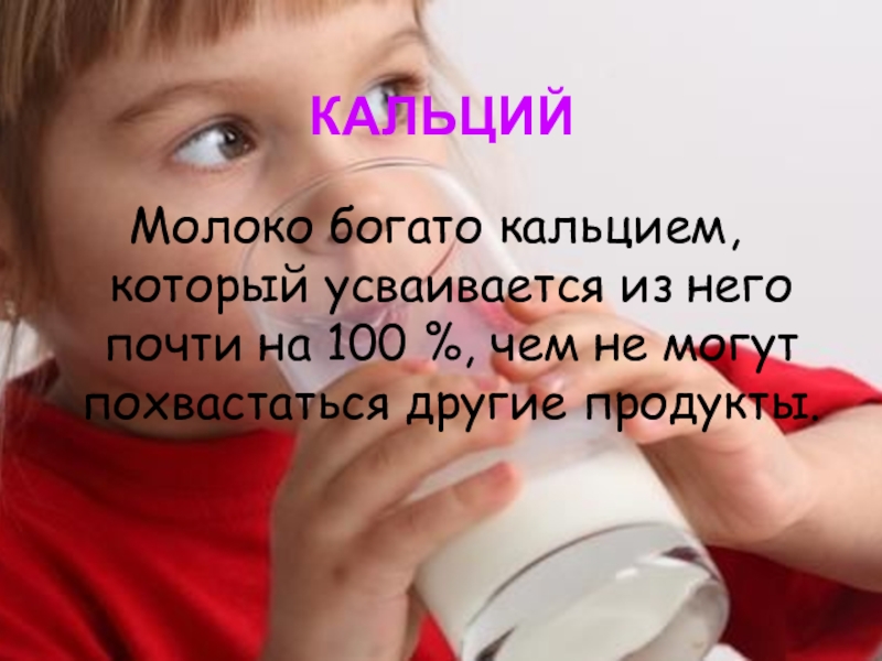 КАЛЬЦИЙМолоко богато кальцием, который усваивается из него почти на 100 %, чем не могут похвастаться другие продукты.