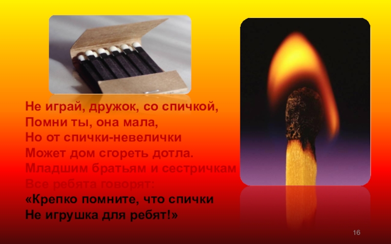 Не играй, дружок, со спичкой, Помни ты, она мала,Но от спички-невеличкиМожет дом сгореть дотла.Младшим братьям и сестричкамВсе