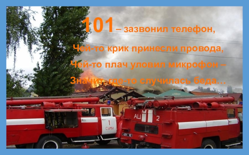 101– зазвонил телефон,Чей-то крик принесли провода,Чей-то плач уловил микрофон –Значит, где-то случилась беда…