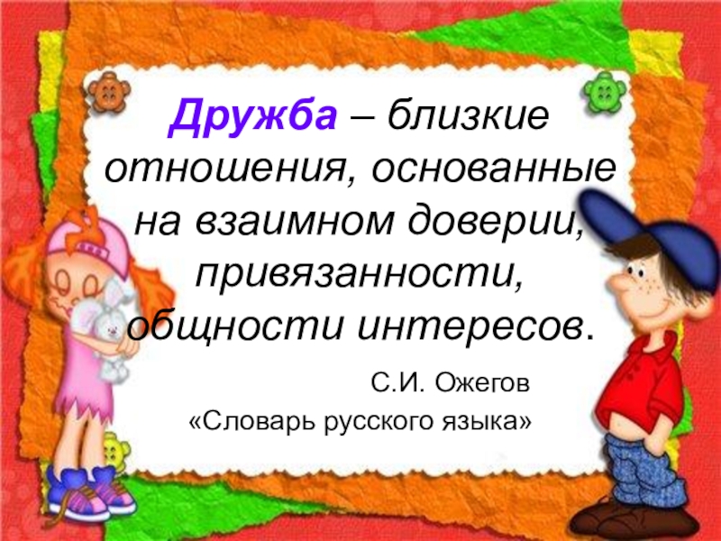 Дружба – близкие отношения, основанные  на взаимном доверии, привязанности,  общности интересов.  					С.И. Ожегов