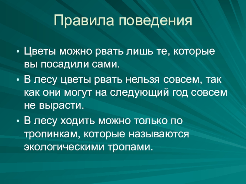 Правила поведенияЦветы можно рвать лишь те, которые вы посадили сами. В лесу цветы рвать нельзя совсем, так
