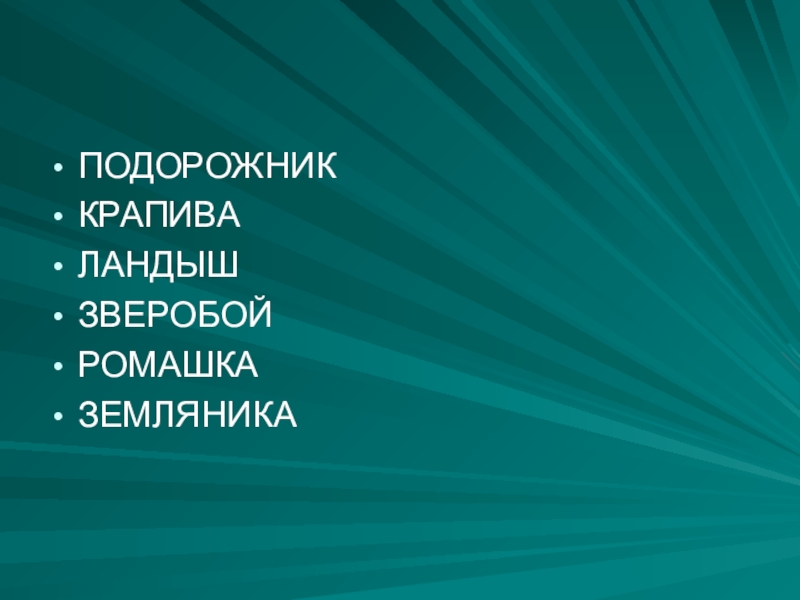 ПОДОРОЖНИККРАПИВАЛАНДЫШЗВЕРОБОЙРОМАШКАЗЕМЛЯНИКА
