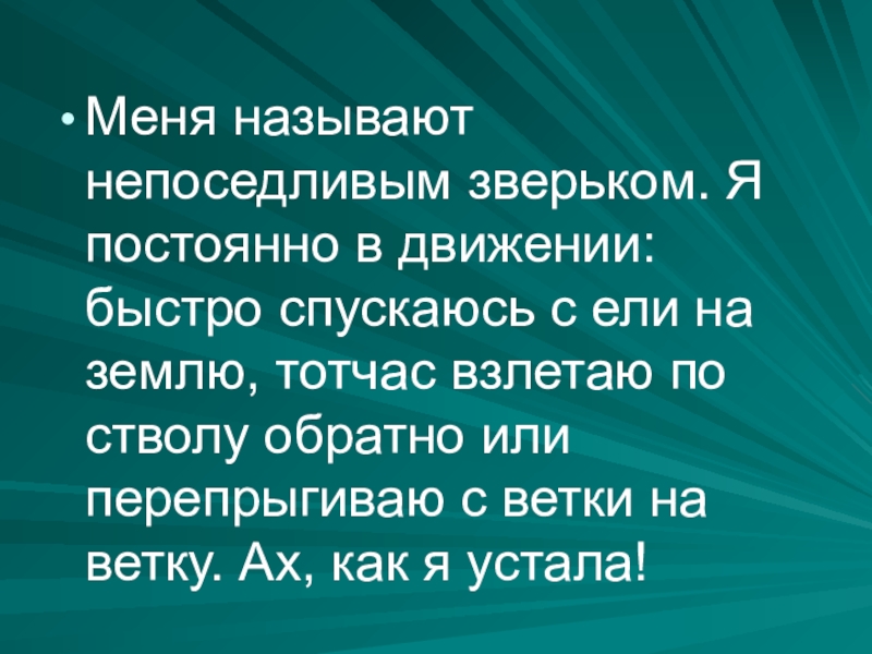 Меня называют непоседливым зверьком. Я постоянно в движении: быстро спускаюсь с ели на землю, тотчас взлетаю по