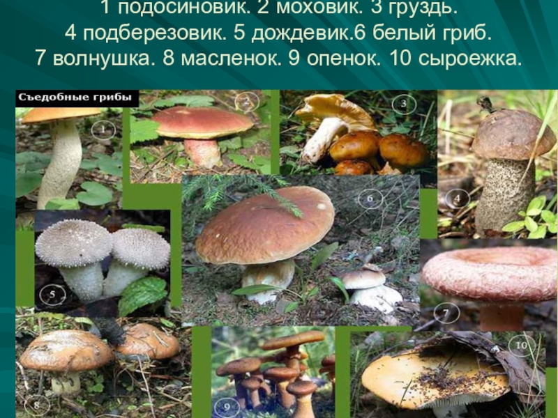 7 волнушка. 8 масленок. 9 опенок. 10 сыроежка.