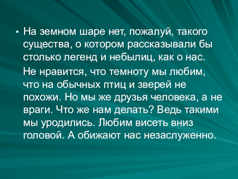 Не нравится, что темноту мы любим, что на обычных птиц и зверей не похожи. Но мы же друзья человека, а не враги. Что же нам делать? Ведь такими мы уродились. Любим висеть вниз головой. А обижают нас незаслуженно.