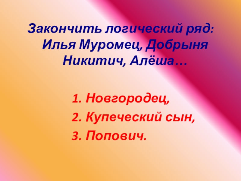 Слайд 15Закончить логический ряд: Илья Муромец, Добрыня Никитич, Алёша…