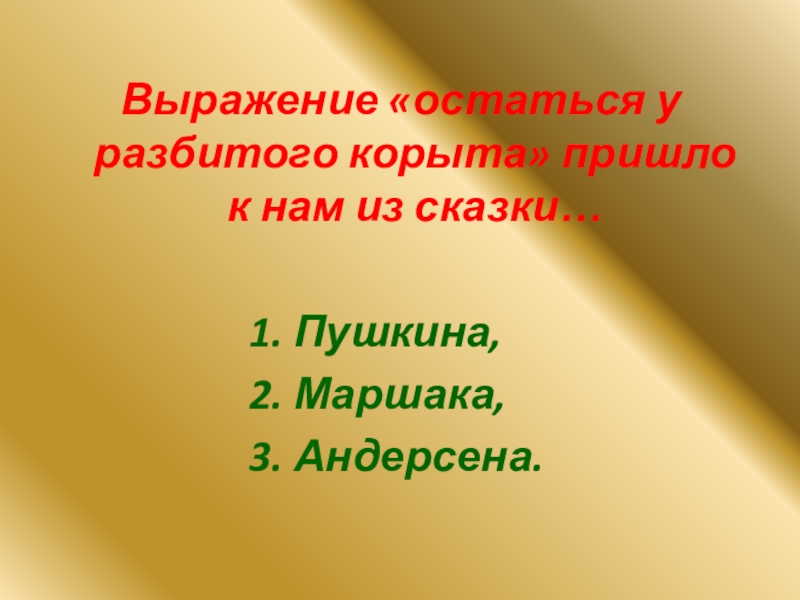 Слайд 11Выражение «остаться у разбитого корыта» пришло к нам из сказки…