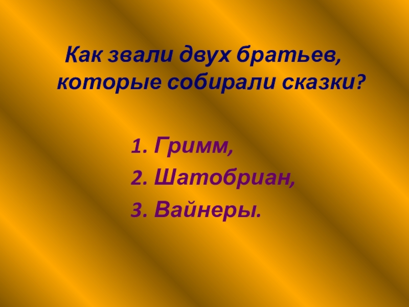 Слайд 14Как звали двух братьев, которые собирали сказки?