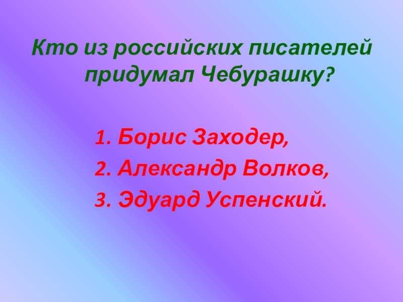 Слайд 20Кто из российских писателей придумал Чебурашку?