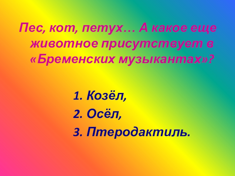 Слайд 13Пес, кот, петух… А какое еще животное присутствует в «Бременских музыкантах»?