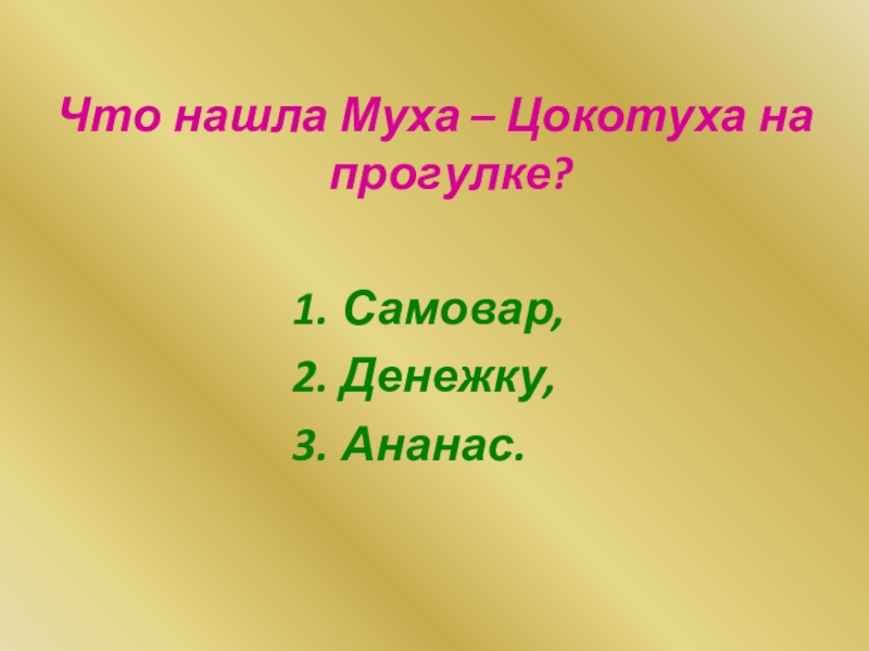 Слайд 23Что нашла Муха – Цокотуха на прогулке?