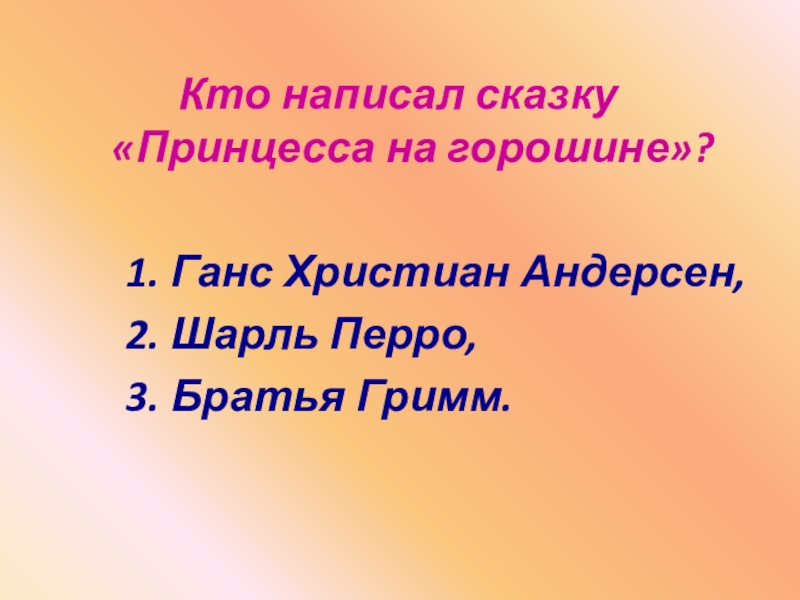 Слайд 19Кто написал сказку «Принцесса на горошине»?