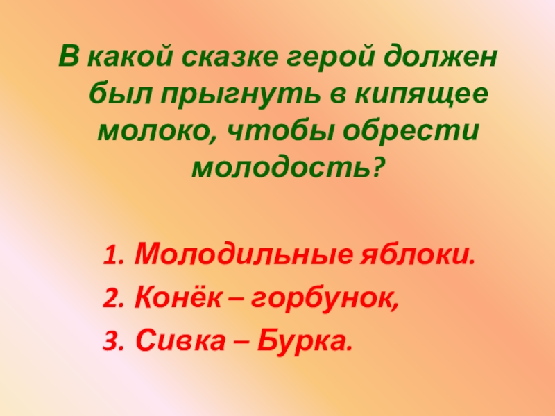 Слайд 8В какой сказке герой должен был прыгнуть в кипящее молоко, чтобы