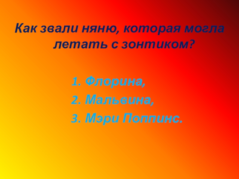 Слайд 17Как звали няню, которая могла летать с зонтиком?