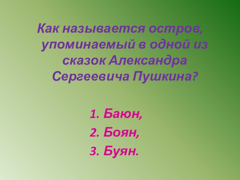 Слайд 9Как называется остров, упоминаемый в одной из сказок Александра Сергеевича Пушкина?