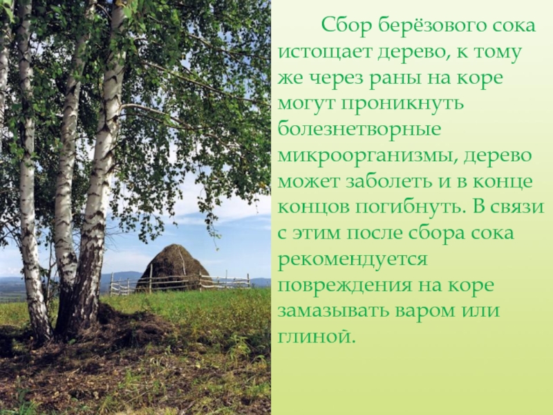Слайд 10 Сбор берёзового сока истощает дерево, к тому же через