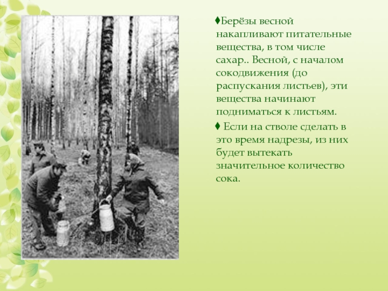 Слайд 9Берёзы весной накапливают питательные вещества, в том числе сахар.. Весной, с
