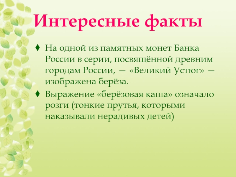 Выражение «берёзовая каша» означало розги (тонкие прутья, которыми наказывали нерадивых детей)