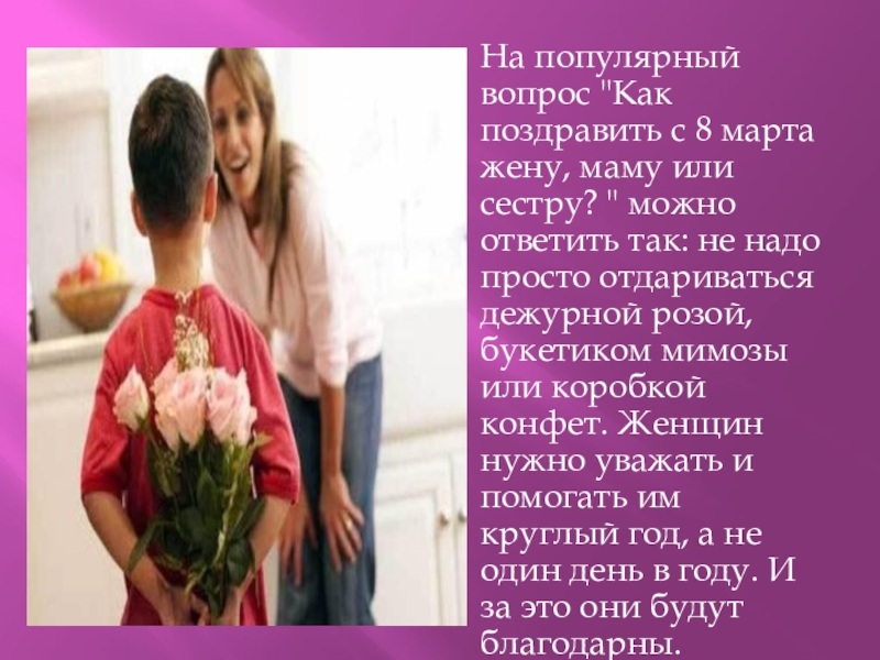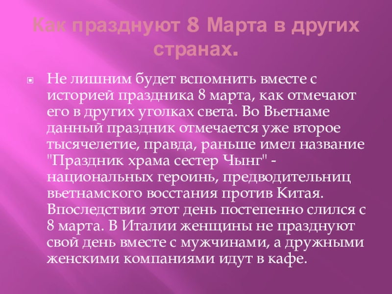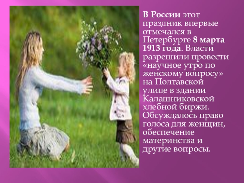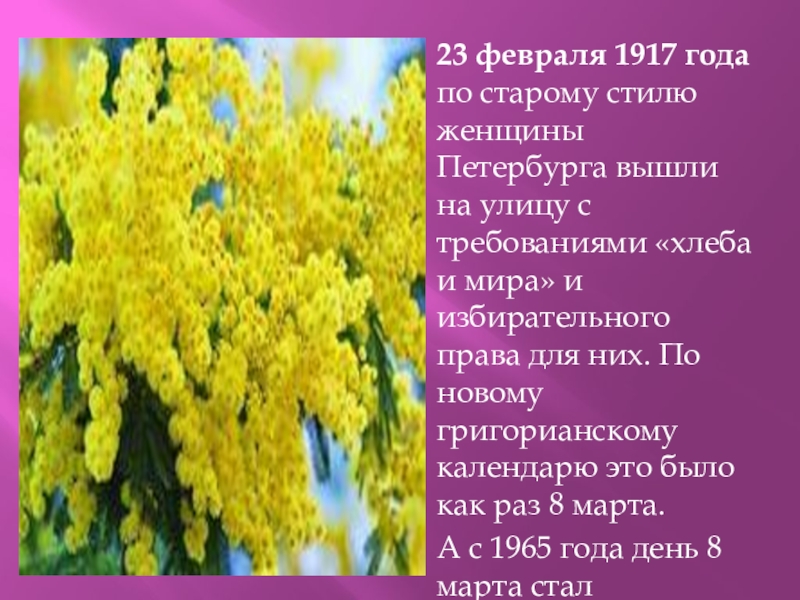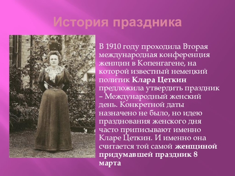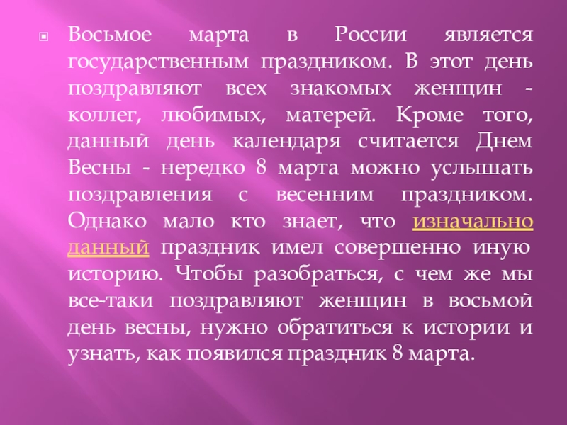 всех знакомых женщин - коллег, любимых, матерей. Кроме того, данный день календаря считается Днем Весны - нередко 8 марта можно услышать поздравления с весенним праздником. Однако мало кто знает, что изначально данный праздник имел совершенно иную историю. Чтобы разобраться, с чем же мы все-таки поздравляют женщин в восьмой день весны, нужно обратиться к истории и узнать, как появился праздник 8 марта.