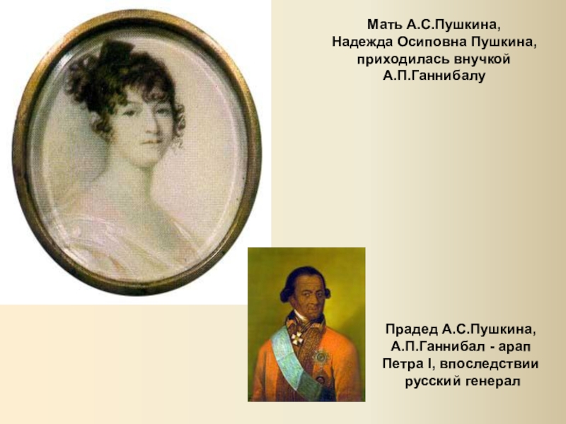 Мать А.С.Пушкина, Надежда Осиповна Пушкина, приходилась внучкой А.П.ГаннибалуПрадед А.С.Пушкина, А.П.Ганнибал - арап Петра I, впоследствии русский генерал