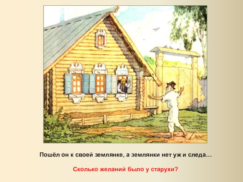 Пошёл он к своей землянке, а землянки нет уж и следа…Сколько желаний было у старухи?