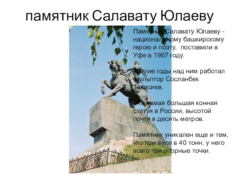 памятник Салавату Юлаеву Памятник Салавату Юлаеву - национальному башкирскому герою и поэту, поставили в Уфе в 1967