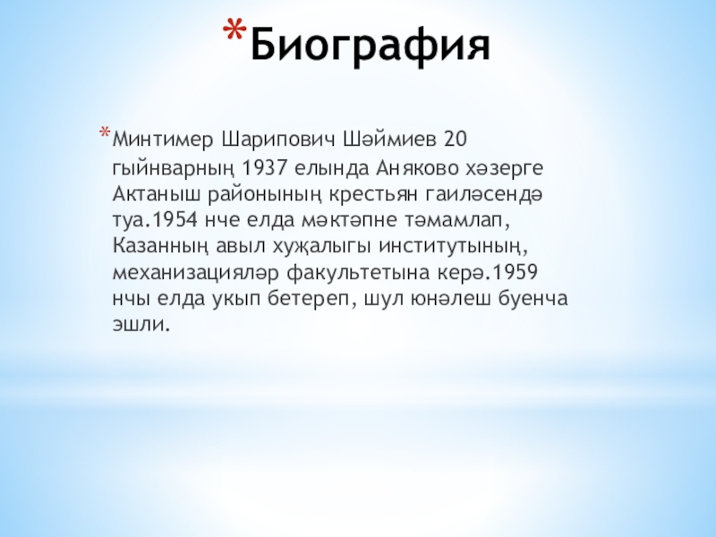 БиографияМинтимер Шарипович Шәймиев 20 гыйнварның 1937 елында Аняково хәзерге Актаныш районының крестьян гаиләсендә туа.1954 нче елда мәктәпне тәмамлап,Казанның авыл хуҗалыгы институтының,механизацияләр факультетына керә.1959 нчы елда укып бетереп, шул юнәлеш буенча эшли.