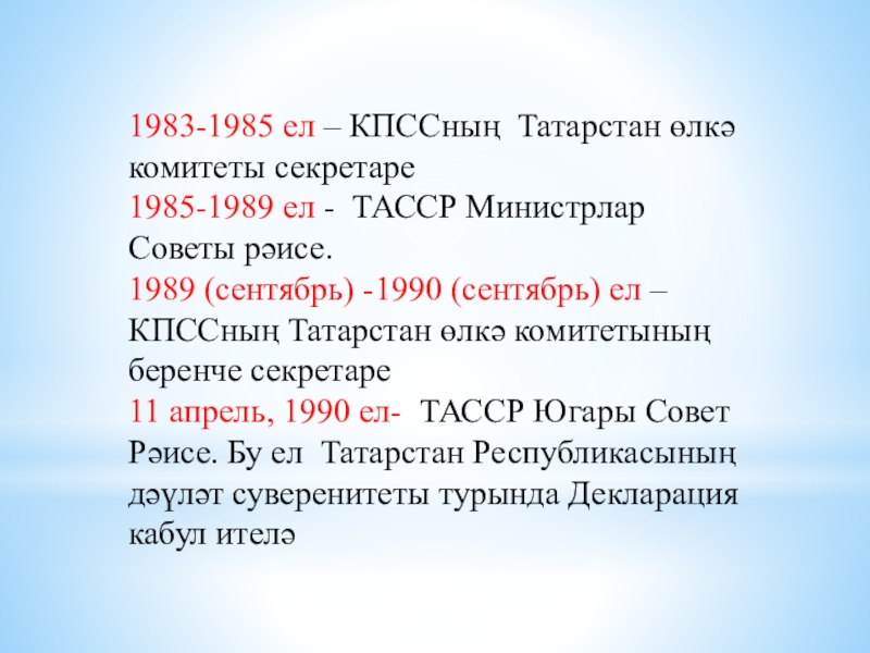 1983-1985 ел – КПССның Татарстан өлкә      комитеты секретаре1985-1989 ел - ТАССР Министрлар