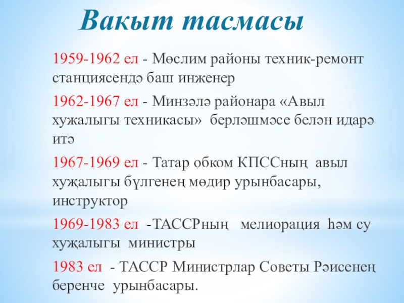 Вакыт тасмасы1959-1962 ел - Мөслим районы техник-ремонт станциясендә баш инженер 1962-1967 ел - Минзәлә районара «Авыл хужалыгы