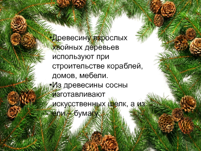 Слайд 6Древесину взрослых хвойных деревьев используют при строительстве кораблей, домов, мебели.