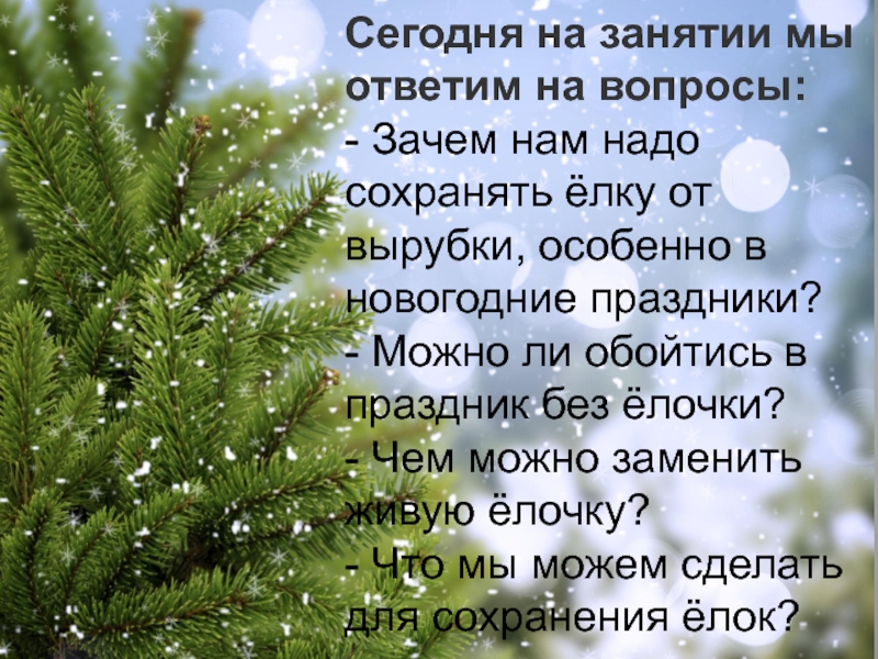 Сегодня на занятии мы ответим на вопросы:- Зачем нам надо сохранять ёлку от вырубки, особенно в новогодние