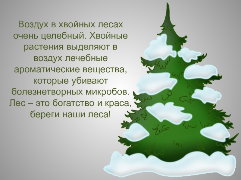 Воздух в хвойных лесах очень целебный. Хвойные растения выделяют в воздух лечебные ароматические вещества, которые убивают болезнетворных