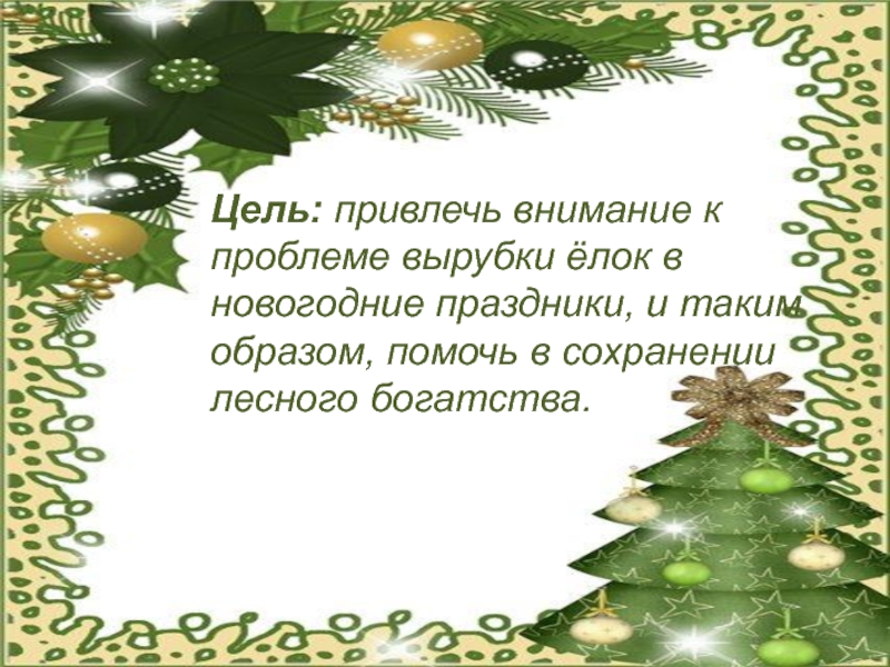 Слайд 2Цель: привлечь внимание к проблеме вырубки ёлок в новогодние праздники, и