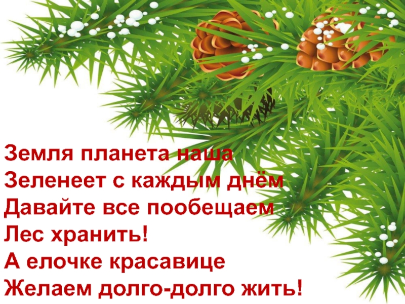 Земля планета нашаЗеленеет с каждым днёмДавайте все пообещаемЛес хранить!А елочке красавицеЖелаем долго-долго жить!
