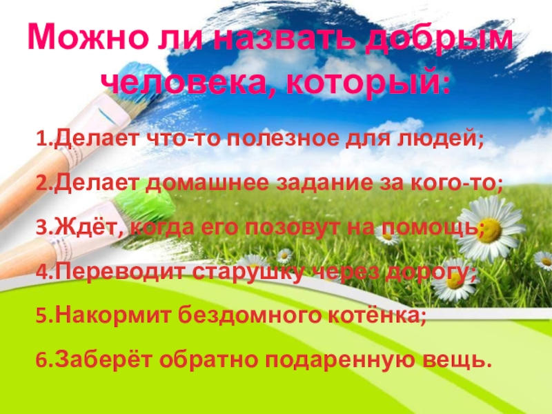 Можно ли назвать добрым человека, который:1.Делает что-то полезное для людей;2.Делает домашнее задание за кого-то;3.Ждёт, когда его позовут