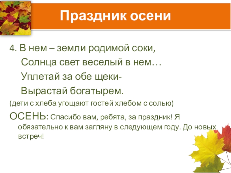 ОСЕНЬ: Спасибо вам, ребята, за праздник! Я обязательно к вам загляну в следующем году. До новых встреч!