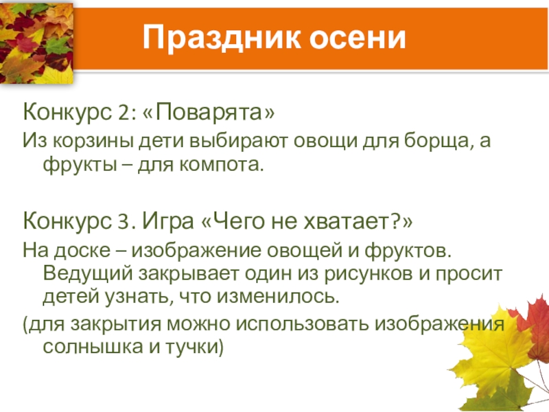 На доске – изображение овощей и фруктов. Ведущий закрывает один из рисунков и просит детей узнать, что изменилось.
