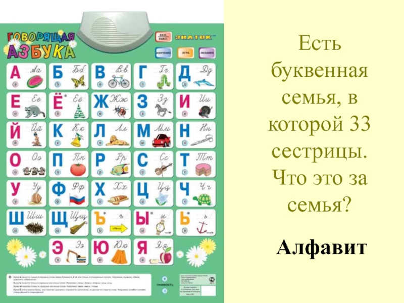 Слайд 44Есть буквенная семья, в которой 33 сестрицы. Что это за семья?