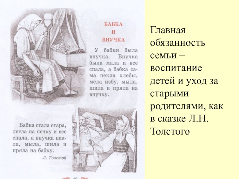 Слайд 13Главная обязанность семьи – воспитание детей и уход за старыми родителями,