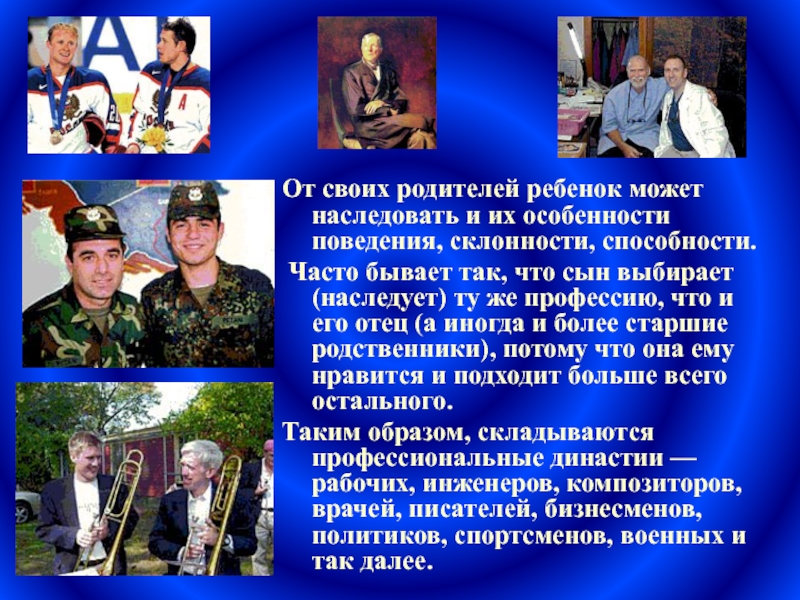 Таким образом, складываются профессиональные династии — рабочих, инженеров, композиторов, врачей, писателей, бизнесменов, политиков, спортсменов, военных и так далее.