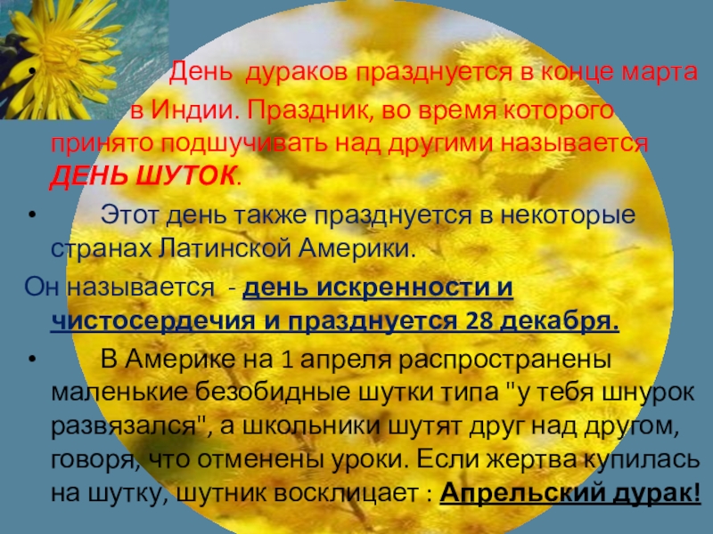 в Индии. Праздник, во время которого принято подшучивать над другими называется ДЕНЬ ШУТОК.
