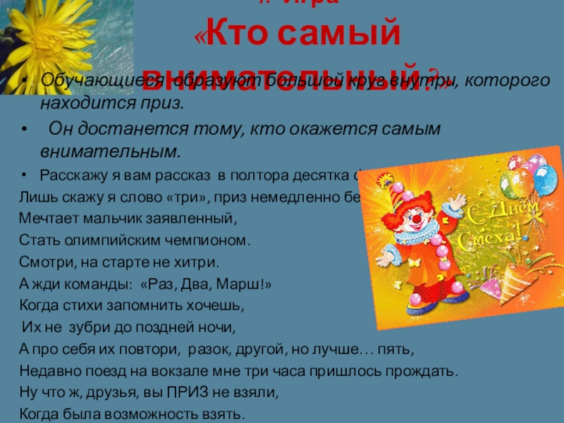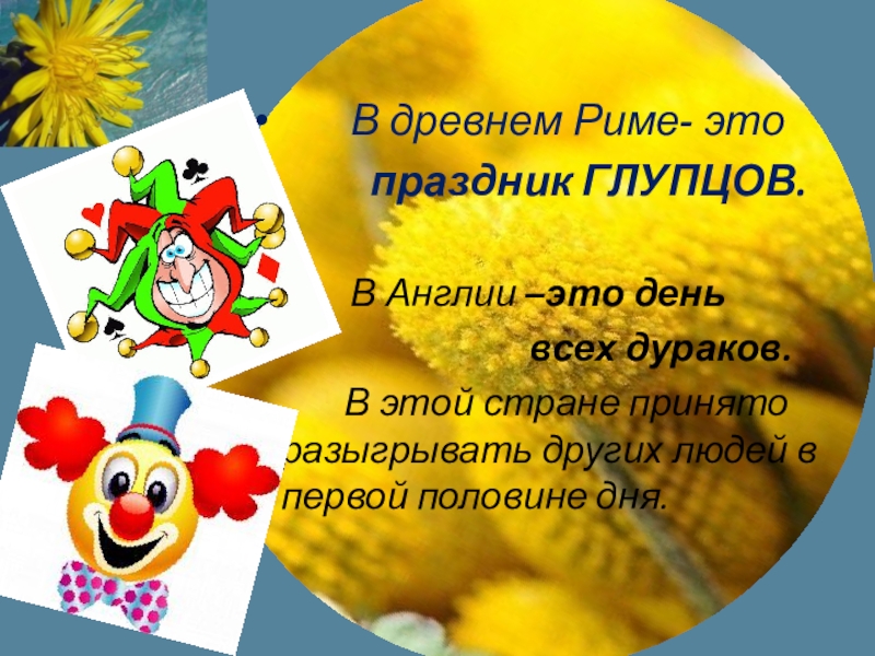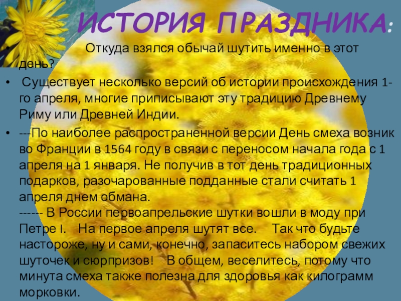 ------ В России первоапрельские шутки вошли в моду при Петре I. На первое апреля шутят все. Так что будьте настороже, ну и сами, конечно, запаситесь набором свежих шуточек и сюрпризов! В общем, веселитесь, потому что минута смеха также полезна для здоровья как килограмм морковки.