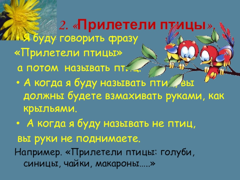 А когда я буду называть птиц, вы должны будете взмахивать руками, как крыльями.