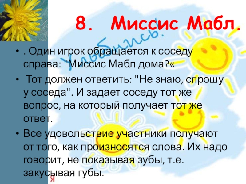 Все удовольствие участники получают от того, как произносятся слова. Их надо говорит, не показывая зубы, т.е. закусывая губы.