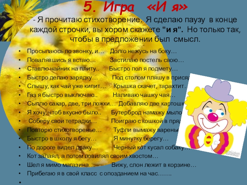 конце каждой строчки, вы хором скажете "и я". Но только так, чтобы в предложении был смысл.